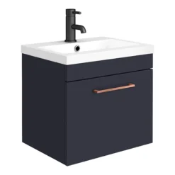 The contemporary matt blue Arezzo furniture package, with it’s clean lines this suite is perfect for renewing the style in any bathroom. The wall hung vanity unit’s stylish modern design hides all unsightly pipework creating a neat modern look. The units soft-closing drawer provides plenty of storage space for toiletries, helping to keep your bathroom clutter free. Features eye-catching and stylish matt blue finish with a on-trend contrasting modern rose gold square bar handle. WC unit comes supplied with a dual flush concealed WC cistern and modern toilet with soft closing seat.