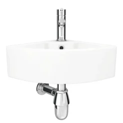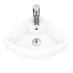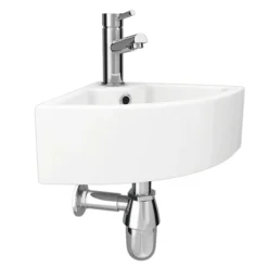Make the most of a small bathroom with the wall mounted Bermuda Corner Cloakroom Basin. With a compact width, it slots easily into tight spaces. This small corner sink is made from a high quality and easy to clean gloss ceramic. It has one tap hole for adding a space saving mixer tap and is finished with a modern curved front.